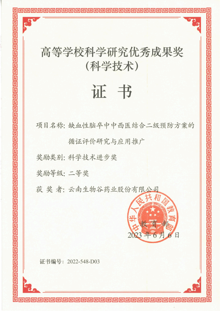 近日,2022年度國家高等學(xué)??茖W(xué)研究優(yōu)秀成果獎(jiǎng)(科學(xué)技術(shù))獎(jiǎng)項(xiàng)評(píng)定頒布,由廣州中醫(yī)藥大學(xué)牽頭、云南生物谷藥業(yè)股份有限公司聯(lián)合共同完成的“缺血性腦卒中中西醫(yī)結(jié)合二級(jí)預(yù)防方案的循證評(píng)價(jià)研究與應(yīng)用推廣”項(xiàng)目榮獲國家教育部科學(xué)技術(shù)進(jìn)步獎(jiǎng)二等獎(jiǎng),這是本年度廣州中醫(yī)藥大學(xué)唯一牽頭獲得該獎(jiǎng)項(xiàng)的項(xiàng)目,也是我公司首度與高??蒲袡C(jī)構(gòu)研發(fā)合作獲得教育部重大獎(jiǎng)項(xiàng)。